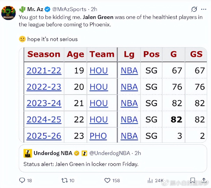 随后太阳官方宣布杰伦-格林因为腿筋伤势复发本场比赛不会回归,他本赛季合计才打四场比赛,而24-25赛季杰伦-格林常规赛打满82场,此前的四个赛季最少的一个赛季都能打67场,联盟又有一个铁人来到凤凰城后倒下了。