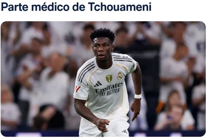 官方:皇马中场琼阿梅尼左腿半腱肌受伤,西媒预计伤缺三周