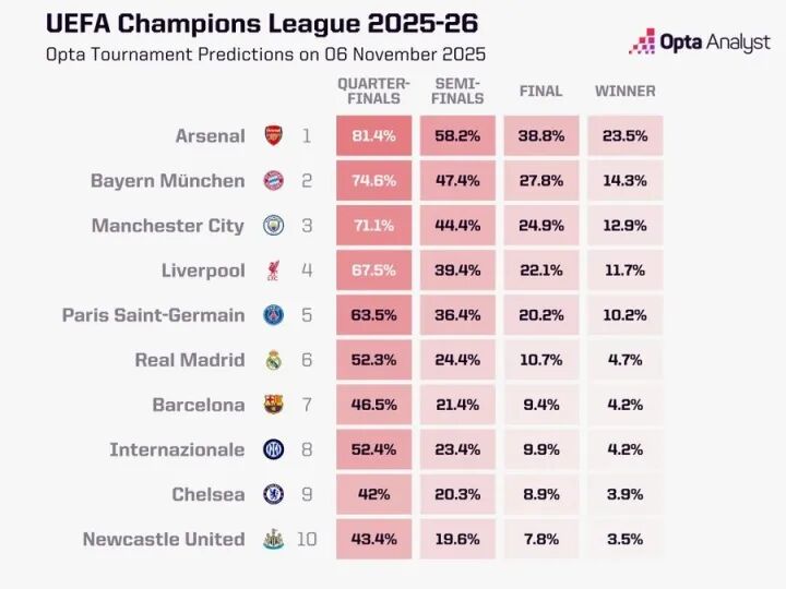 欧冠夺冠概率:阿森纳超23%断档领跑,拜仁曼城红军巴黎皇马2-6位